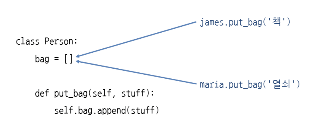 Person.bag.append(stuff) # 클래스 이름으로 클래스 속성에 접근