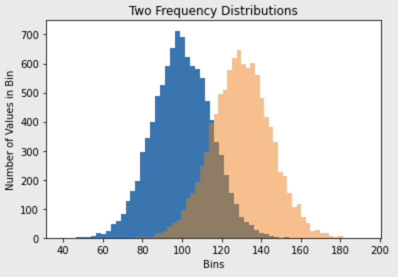 3. 도수를 50개 구간으로 표시하며, 확률 밀도가 아닌 빈도로 표기한다.