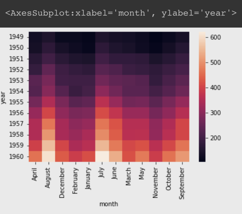 예제) 데이터의 연도와 달에 대한 탑승객 수를 heatmap으로 표현하기