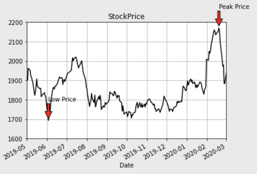 important_data = [(datetime(2019, 6, 3), "Low Price"),(datetime(2020, 2, 19), "Peak Price")]