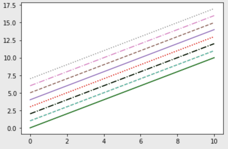 plt.plot(x, x + 7, linestyle=':'); # dotted