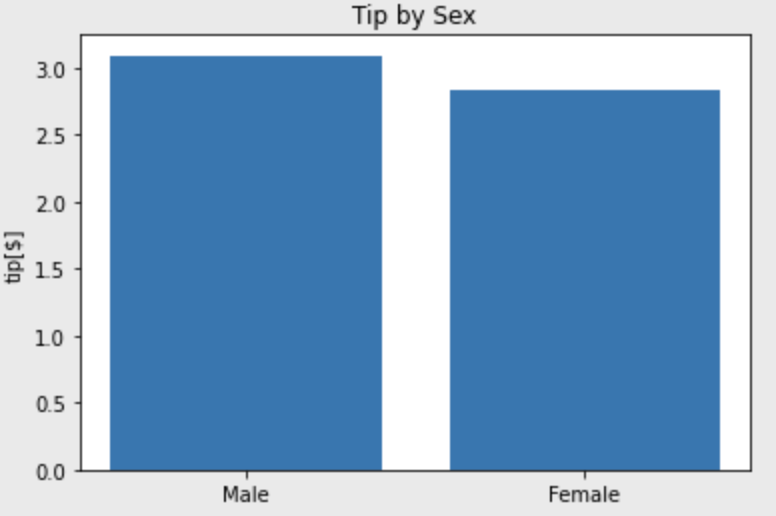 sns.barplot의 인자로 df를 넣고 원하는 컬럼을 지정해주면 성별에 대한 팁 평균이 나온다.
