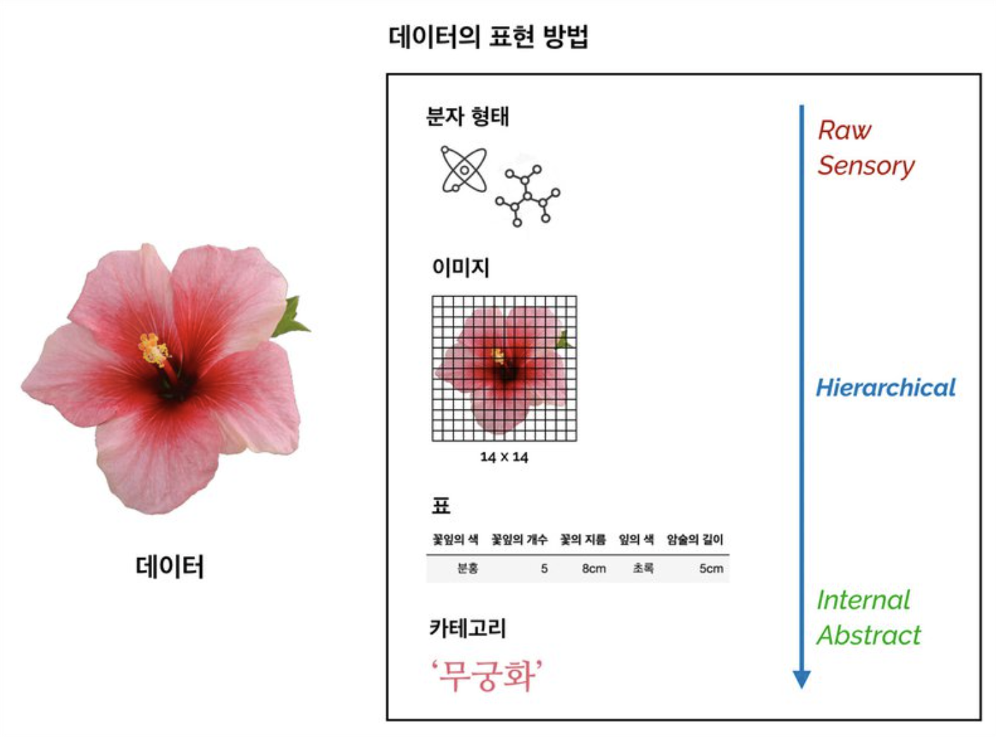 데이터의 내재된 표현: 데이터가 담고 있는 정보의 총체, 함의를 나타내는 표현. 단 raw한 sensory 데이터는 그 자체로는 중요한 의미를 담지 못하고 있을 수 있다.