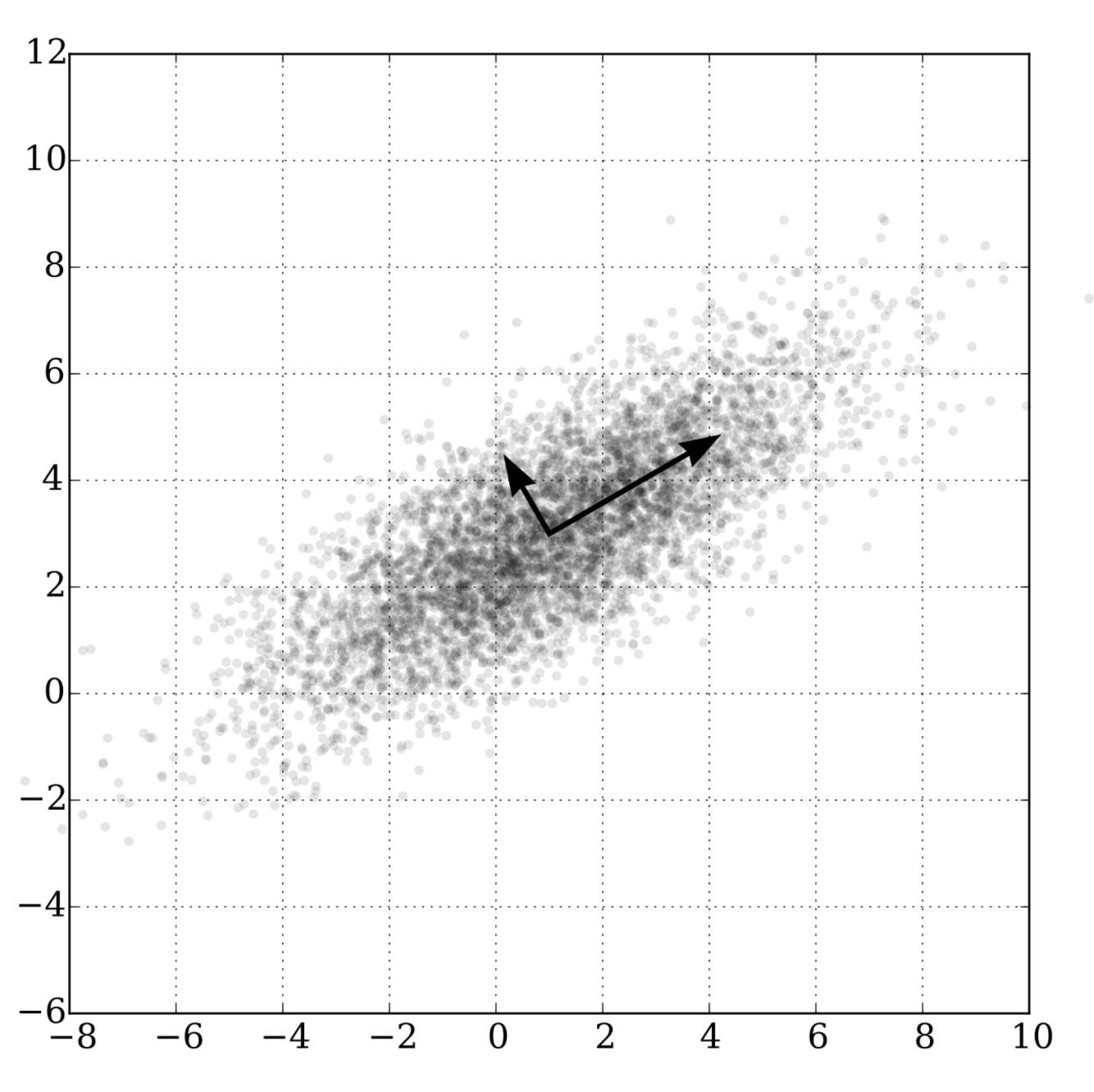 위 그림에서 보이는 우상향의 긴 화살표와 좌상향의 짧은 화살표를 새로운 좌표축으로 삼을 수 있을 것이다. 이렇게 새로운 좌표계 역할을 할 수 있는 벡터의 모음을 기저basis라고 한다.