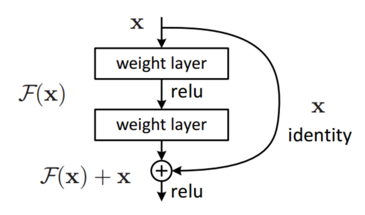 Skip Connection은 레이어의 입력을 다른 곳에 이어서 Gradient가 깊은 곳까지 이어지도록 한다. 아래 그림처럼 레이어와 Skip Connection이 있는 블록을 Residual Block이라고 한다.