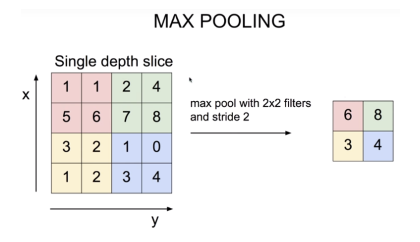 - translation invariance 효과: 이미지는 약간의 상하좌우 이동이 생긴다고 해도 내용상 동일한데, max pooling을 통해 인접한 영역 중 가장 특징이 두드러진 영역 하나를 뽑는 것은 오히려 약간의 이동에도 불구하고 동일한 특징을 안정적으로 잡아낼 수 있어 오히려 object 위치에 대한 오버피팅을 방지하고 안정적인 특징 추출 효과를 가져온다.