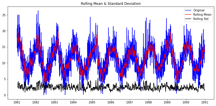 현재 타임 스텝부터 window에 주어진 타임 스텝 이전 사이 구간의 평균(rolling mean, 이동평균)과 표준편차(rolling std, 이동표준편차)를 원본 시계열과 함께 시각화해보자.