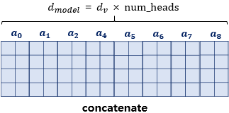 트랜스포머는 이렇게 입력된 문장 행렬을 num_heads의 수만큼 쪼개서 어텐션을 수행하고, 얻은 num_heads의 개수만큼의 어텐션 값 행렬을 다시 하나로 이어준다.(concatenate